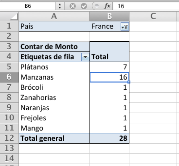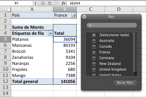 Debido a que hemos añadido el campo País al filtro del Informe, podemos filtrar la tabla dinámica por País. Por ejemplo, cuáles productos hemos exportado más a Francia?