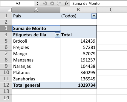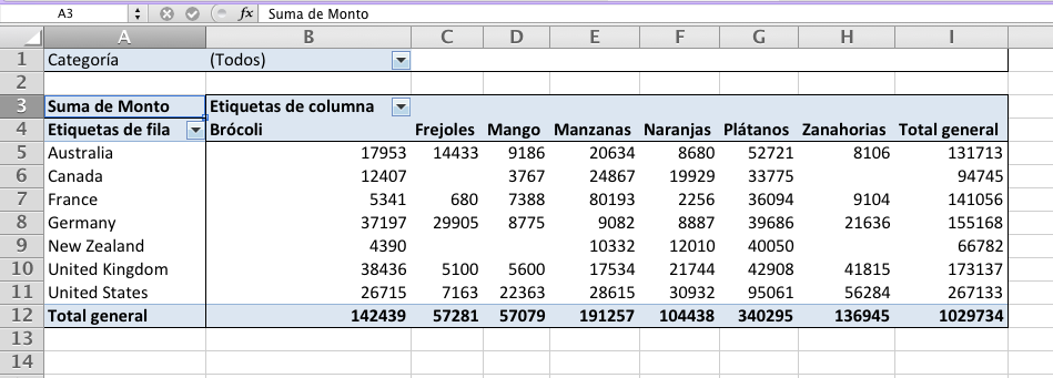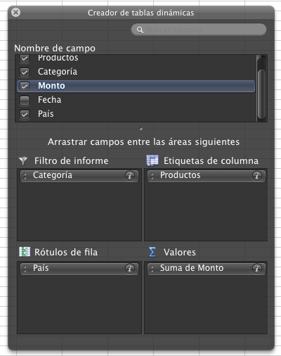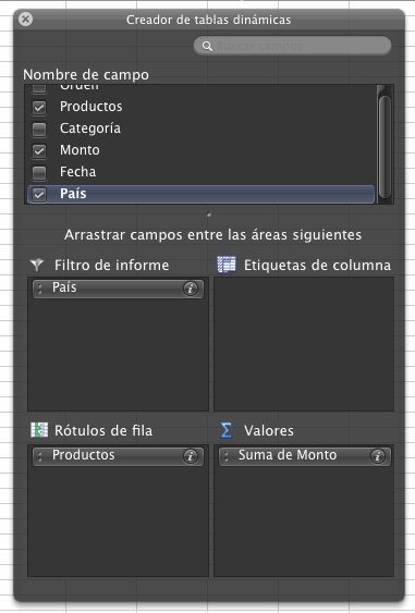 Si usted arrastra un campo al área Rótulos de Fila y Etiquetas de Columna, usted puede crear una tabla dinámica de dos dimensiones. Por ejemplo, para obtener el monto total exportado a cada país, de cada producto, arrastre los siguientes campos a las diferentes áreas.