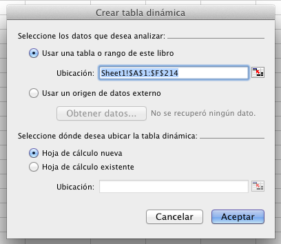 Aparece la siguiente caja de diálogo. Excel automáticamente selecciona por usted la data. La ubicación por defecto de una nueva tabla dinámica es una Nueva Hoja de Cálculo