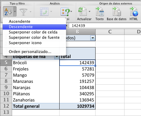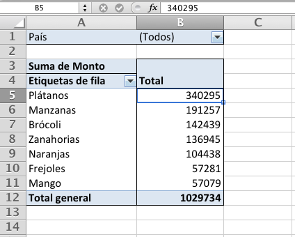 Para tener a la Banana en el tope de la lista, ordene la tabla dinámica.